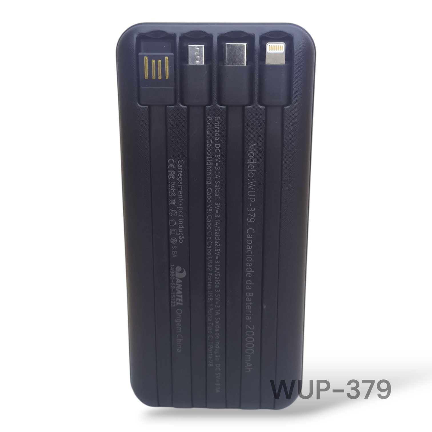 20000MAH / COM LED DIGITAL / INDUÇÃO / DC5/3.1A / CABO: USB, USB-C, V8, LIGHTNING / ENTRADA: 2X USB, 1XUSB-C